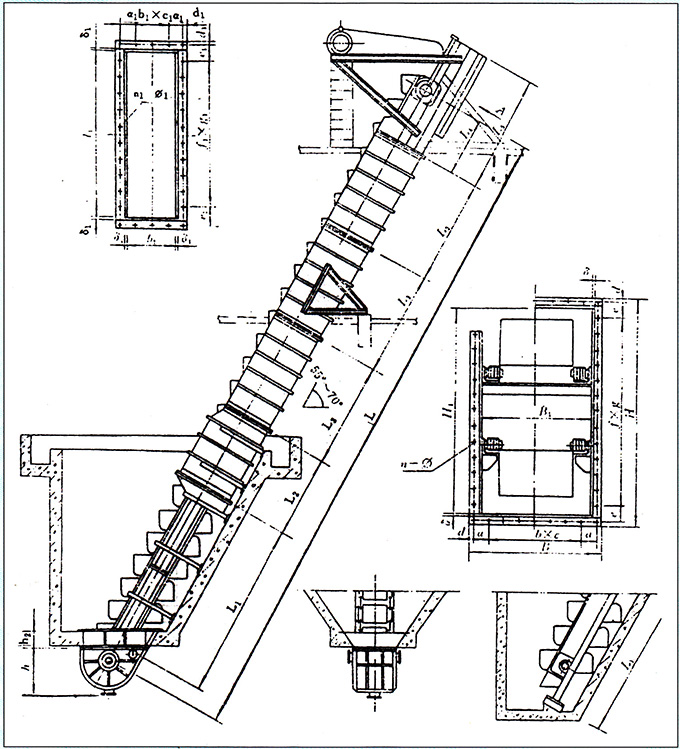 L型撈坑裝潢式提升機用于從撈坑沉淀池中提運大顆粒精煤和細粒煤,并使之在提運過程中自行脫水。
