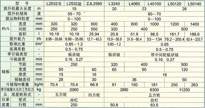 注:ZJL型為間斷斗子,即每兩個鏈節有一個斗子。和連接斗子(每一個鏈節有一個斗子)相比,不易將上個斗子的水滴到下個斗子中去,與L2532相比,提升能力相當。對于小型選煤廠,工藝流程比較簡單,撈出的物料當沒有篩機再次脫水時,選用更為合適。